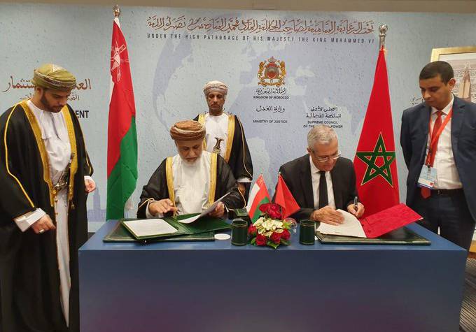 وقع معالي الشيخ عبد الملك بن عبد الله الخليلي (وزير العدل – رئيس مجلس المعهد العالي للقضاء) مع نظيره المغربي معالي محمد بن عبد القادر (وزير العدل – رئيس مجلس إدارة المعهد القضائي بالمملكة المغربية)، مذكرة تفاهم بين المعهد العالي للقضاء بالسلطنة ونظيره المغربي وذلك بمدينة مراكش المغربية، وذلك يوم الثلاثاء الموافق 22 من أكتوبر 2019م.