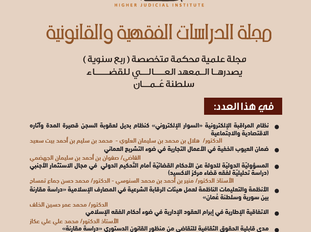 وصرَّح الدكتور عبد الرحيم بن سيف القصابي، عضو هيئة التحرير بالمجلة-رئيس قسم البحوث والشؤون القانونية، ان العدد الجديد تضمن مجموعة من البحوث المحكمة التي تناولت قضايا فقهية وقانونية معاصرة، ومن أبرز هذه البحوث: بحث حول نظام المراقبة الإلكترونية (السوار الإلكتروني) بوصفه بديلاً لعقوبة السجن قصيرة المدة، وبحث في ضمان العيوب الخفية في الأعمال التجارية في ضوء التشريع العُماني، إلى جانب دراسة تناولت المسؤولية الدولية للدولة عن الأحكام القضائية أمام التحكيم الدولي في مجال الاستثمار الأجنبي.